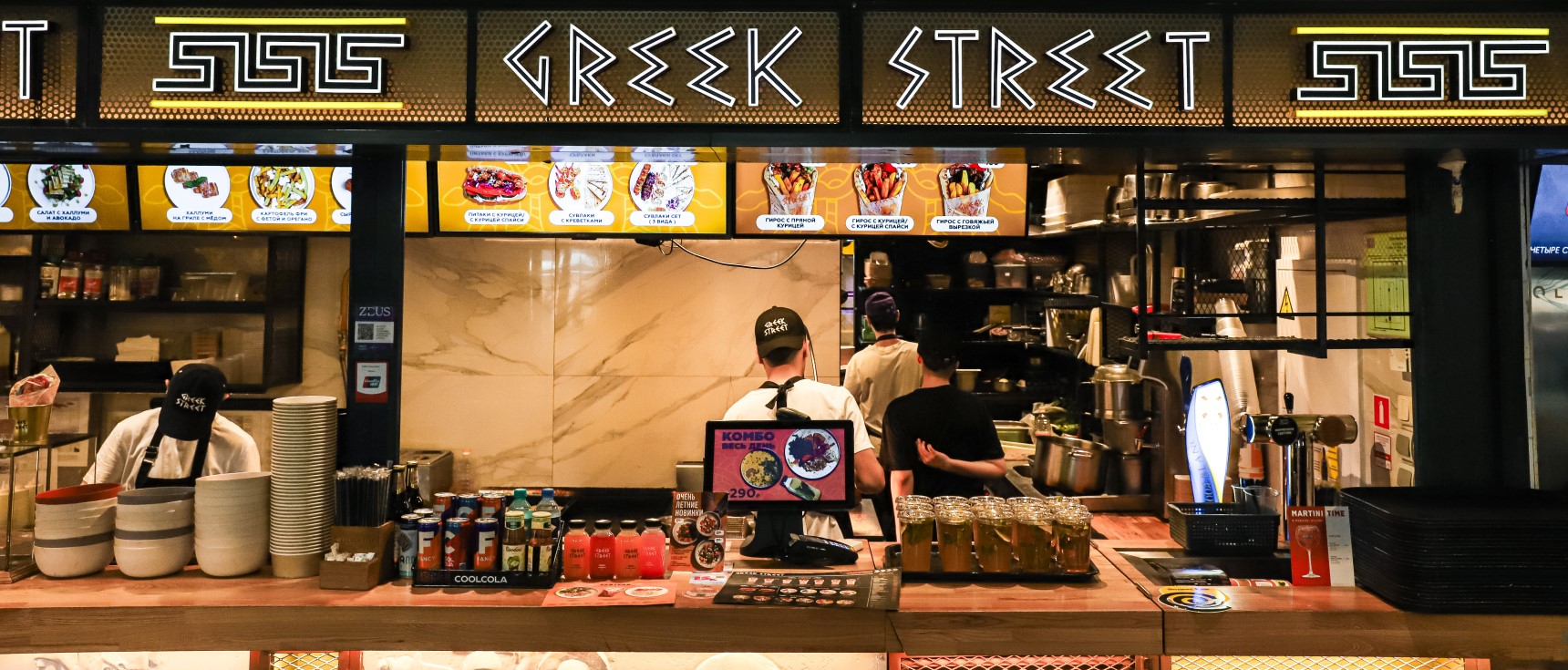 В Greek Street все, как на улицах Греции: обилие вкусов и ароматов. И готовят все на ваших глазах из свежих, натуральных продуктов — никаких полуфабрикатов и готовых блюд. Настоящие ценители греческой кухни по достоинству оценят традиционные шашлычки сувлаки и фирменное мезе, состоящее из 5 греческих закусок.