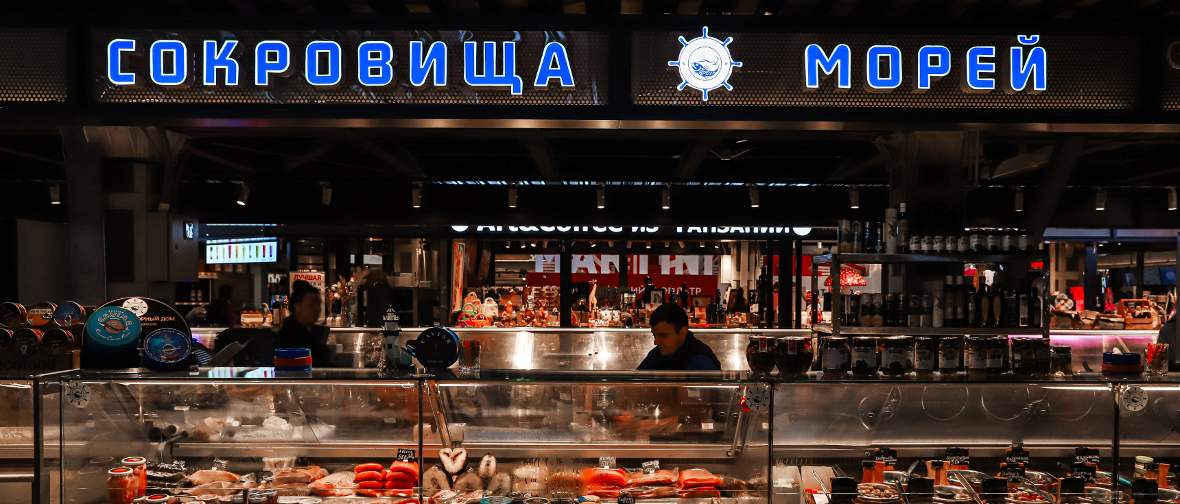 Главное рыбное место фудмолла «Депо.Москва». «Сокровища морей» – самый большой магазин рыбы и морепродуктов в «Депо.Москва».
